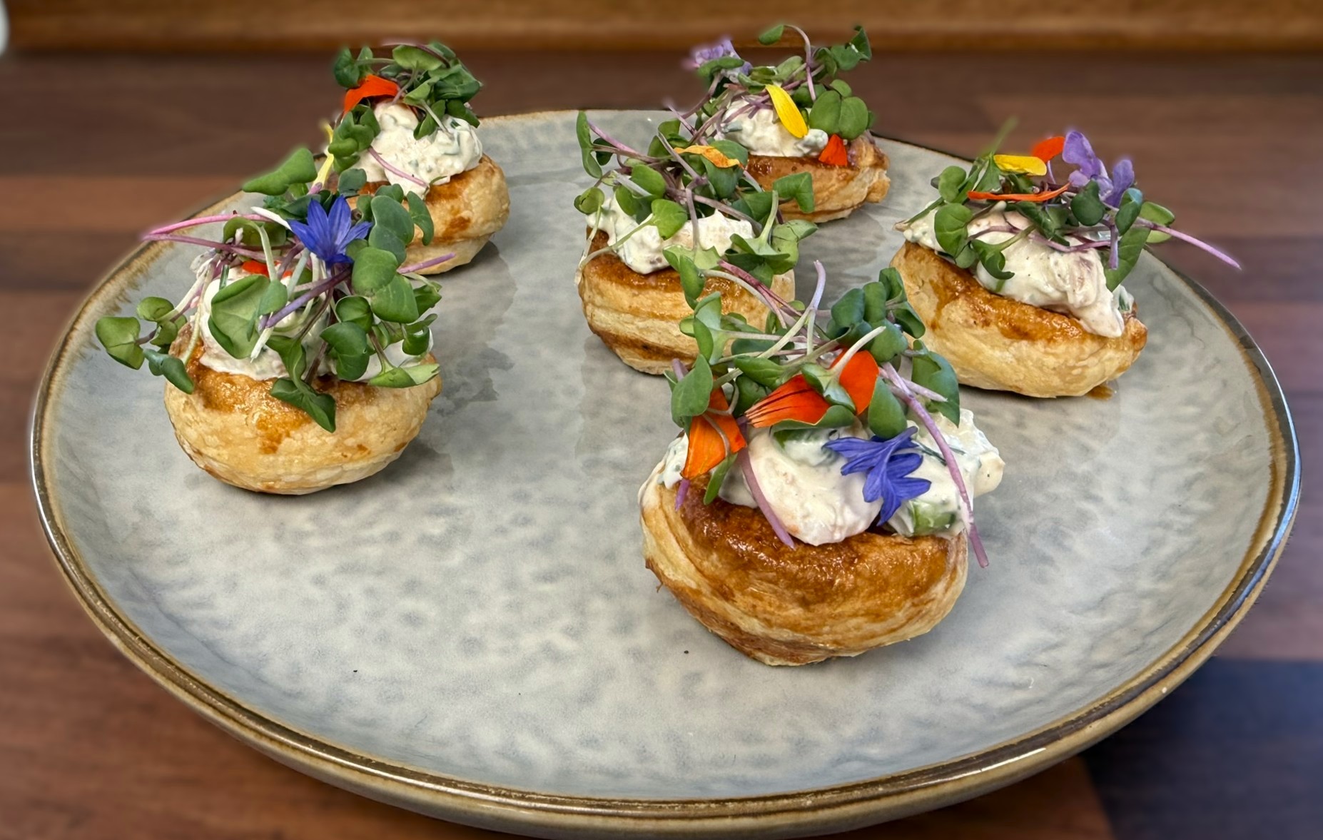 Butterdejssnegle med Skagensrejer og bacon er en sprød og smagfuld snack, hvor gylden butterdej møder et cremet og fyldigt rejefyld. Kombinationen af saftige Skagensrejer, sprødt bacon og friske grøntsager giver en perfekt balance mellem fedme, friskhed og sprødhed.